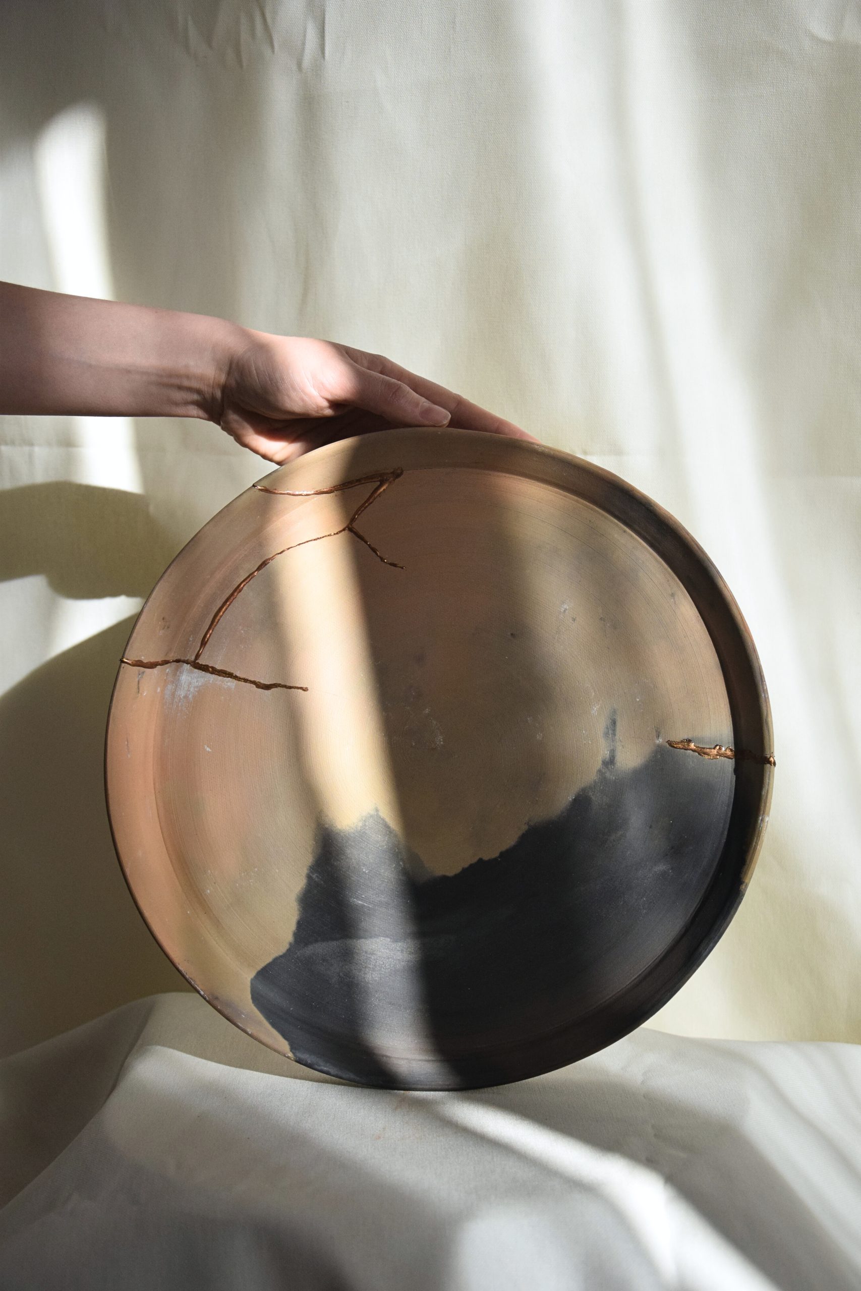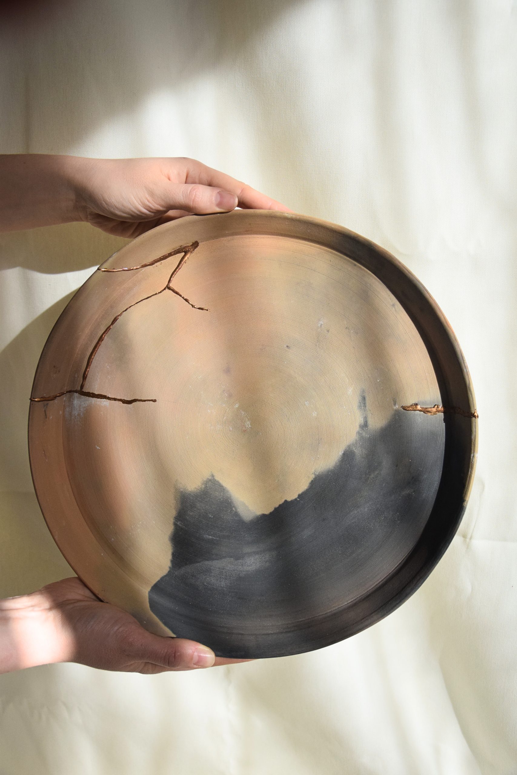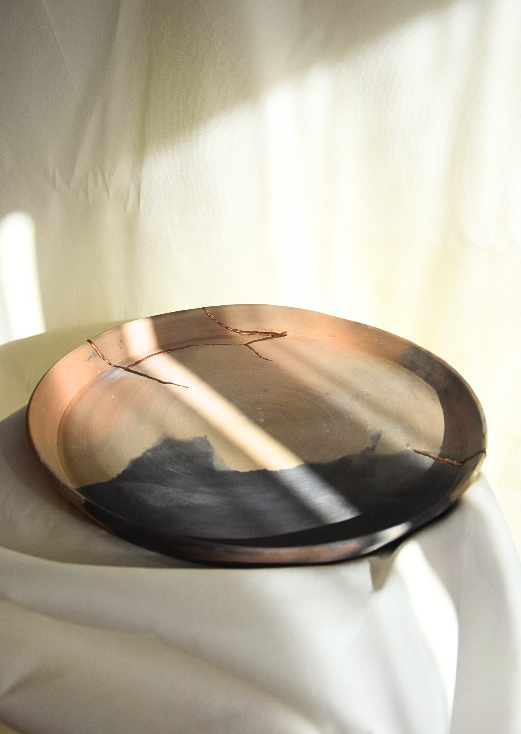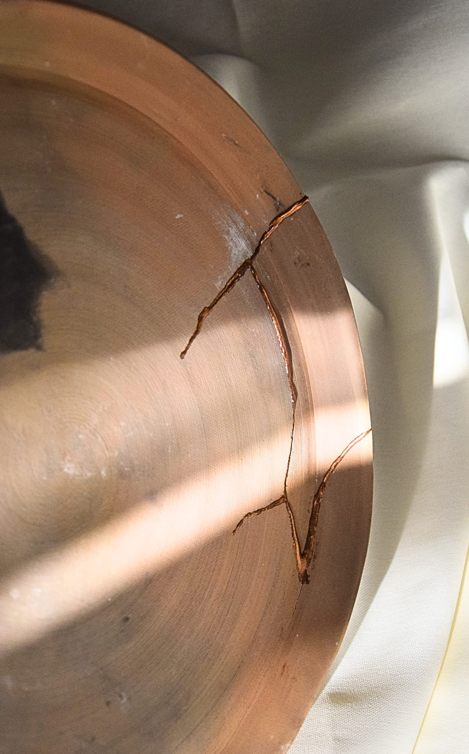 Assiette fendue lors de la cuisson et recollée façon « kintsugi » à la colle et patine cuivrée.