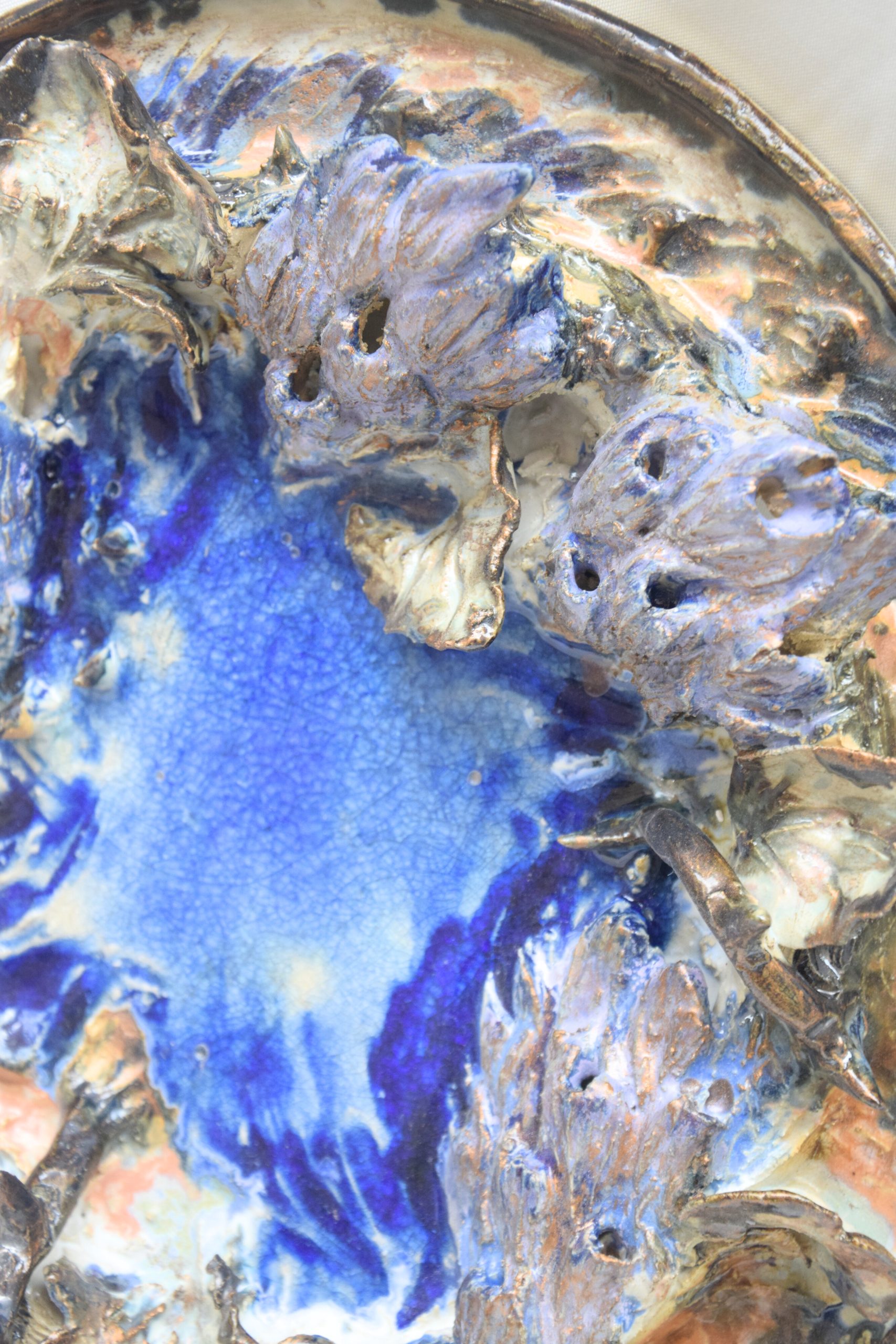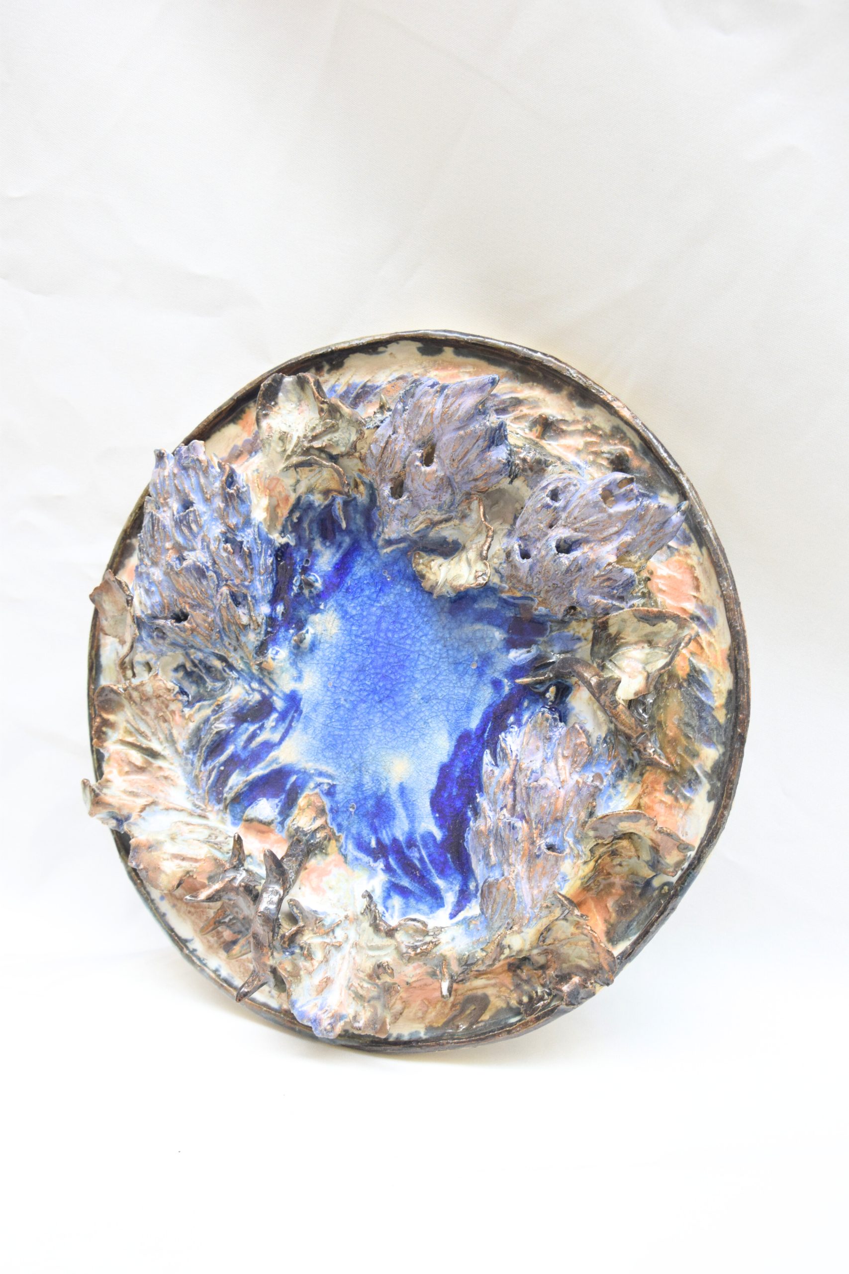 Technique : modelage, grès roux, superpositions d’émaux et verre de bouteille de bière fusionné lors de la cuisson haute température.