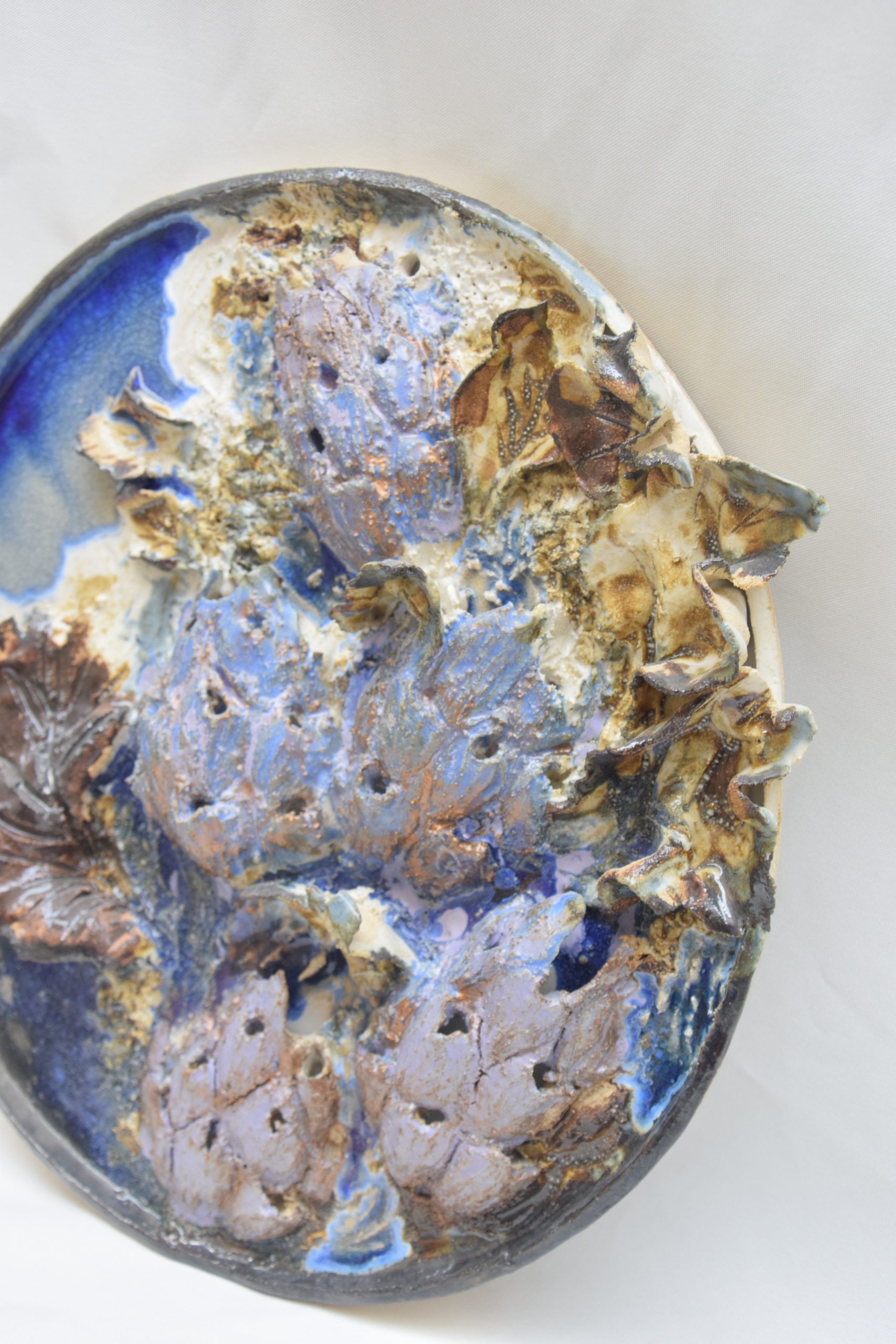 Technique : modelage, grès roux, superpositions d’émaux et verre de bouteille de bière fusionné lors de la cuisson haute température.