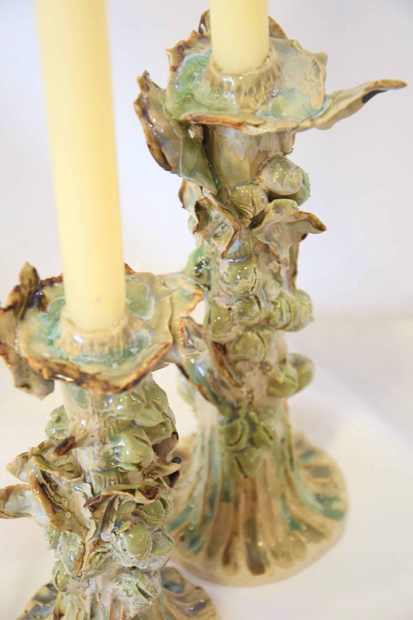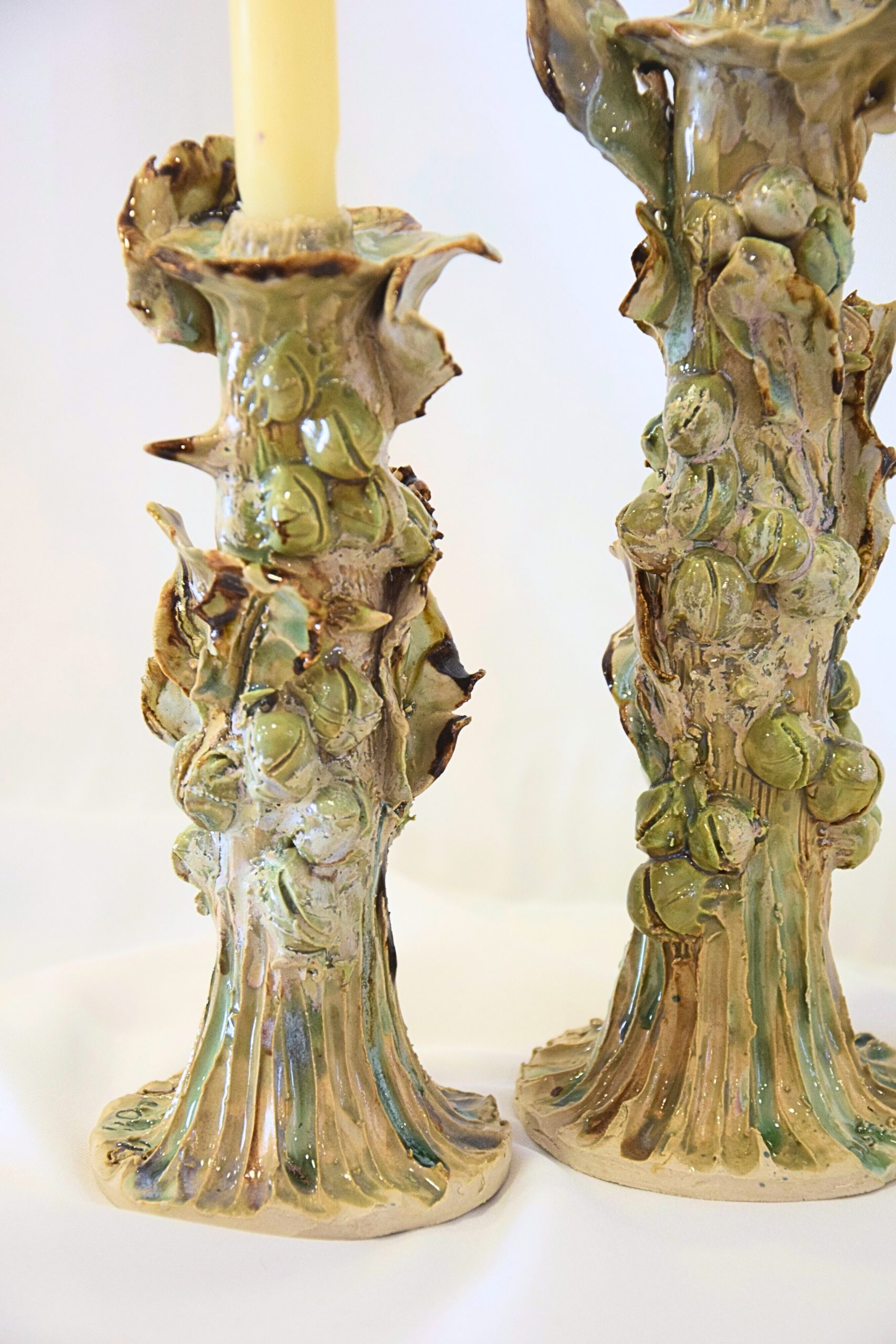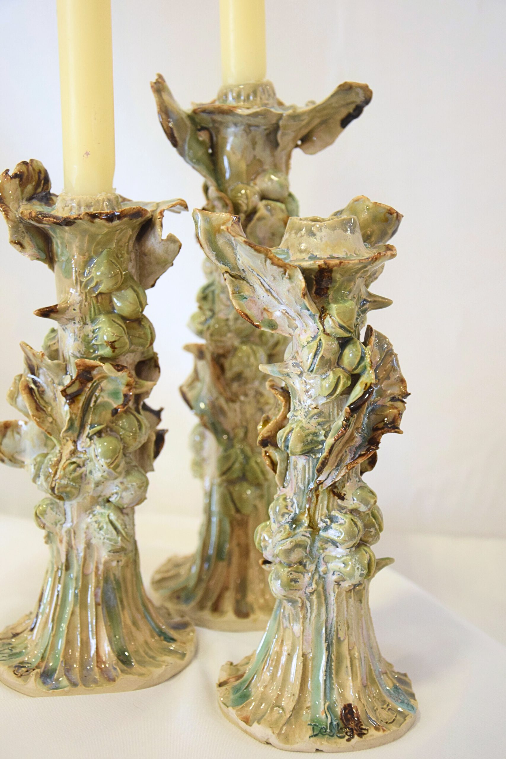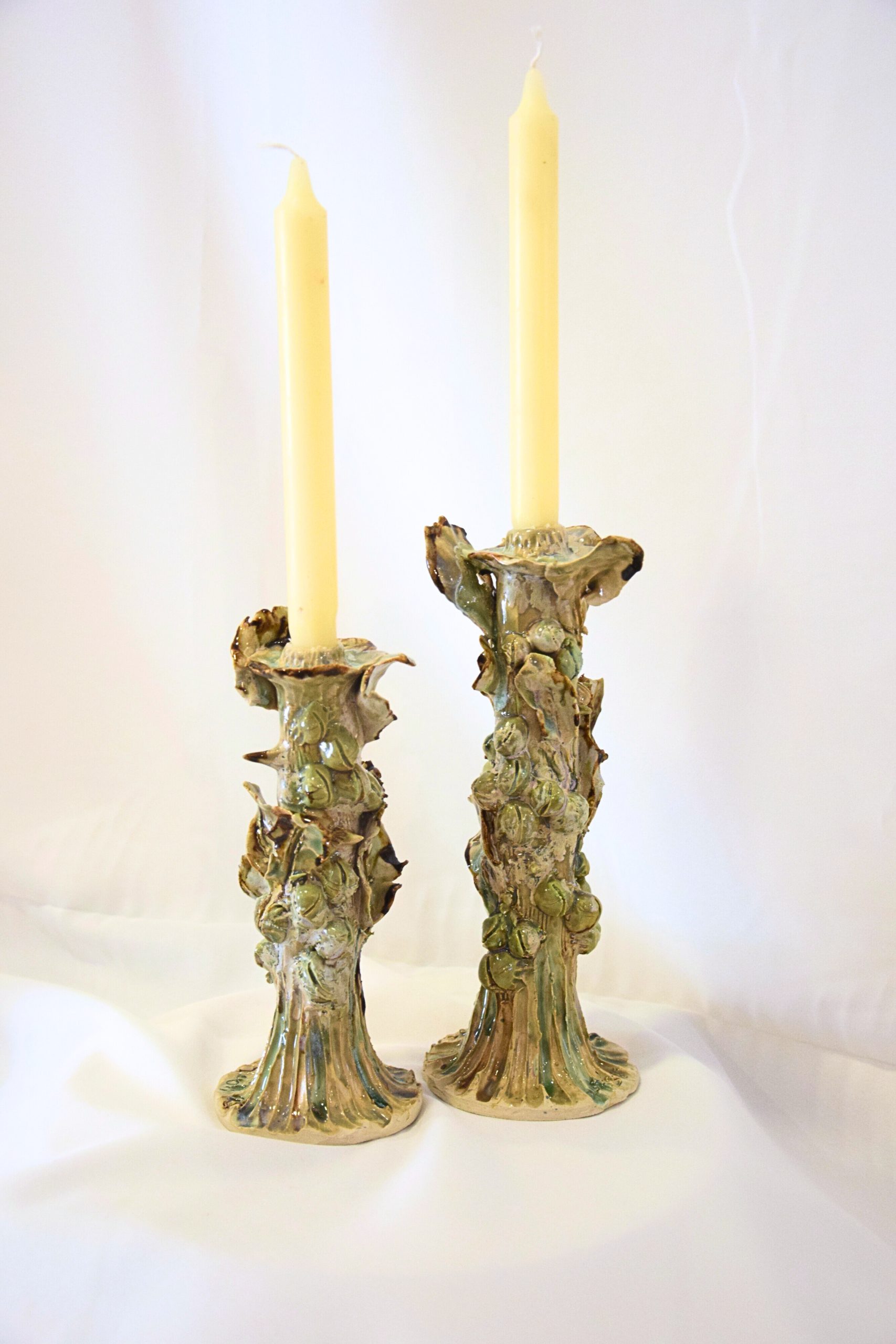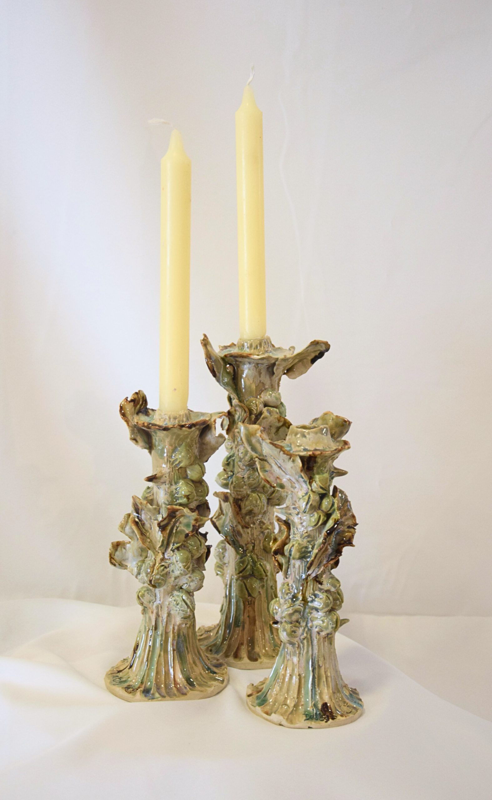 Des pichets façonnés au tour de potier puis agrémentés d’éléments modelés, des bougeoirs peuplés de choux de Bruxelles rococo, on retrouve dans ces objets qui flirtent avec la sculpture, des éléments de mes précédentes compositions.