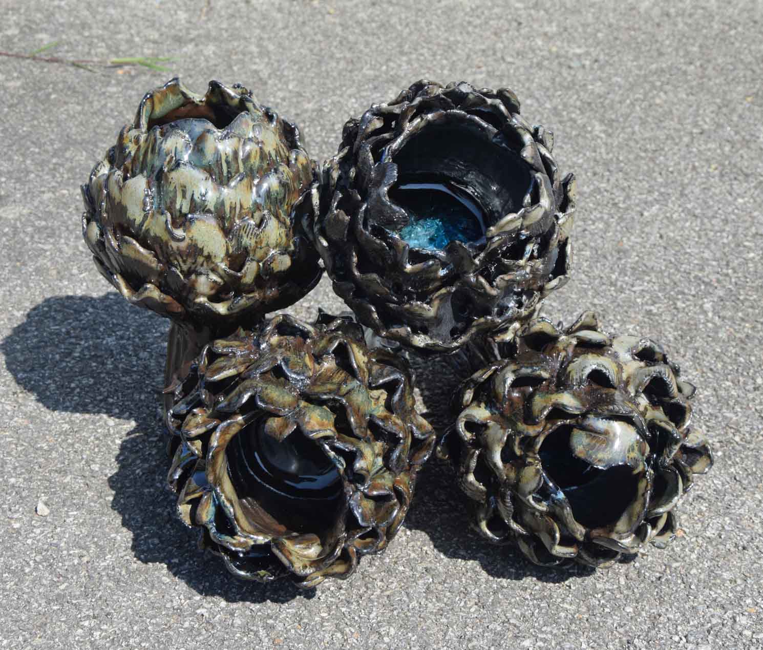 Ce légume-fleur, que l’on effeuille pour y trouver le cœur, se déploie dans mes sculptures comme une nature morte piquante : un élément de paysage fictif qui se nourrit d'expériences, de voyages et d'hommages à des références artistiques.