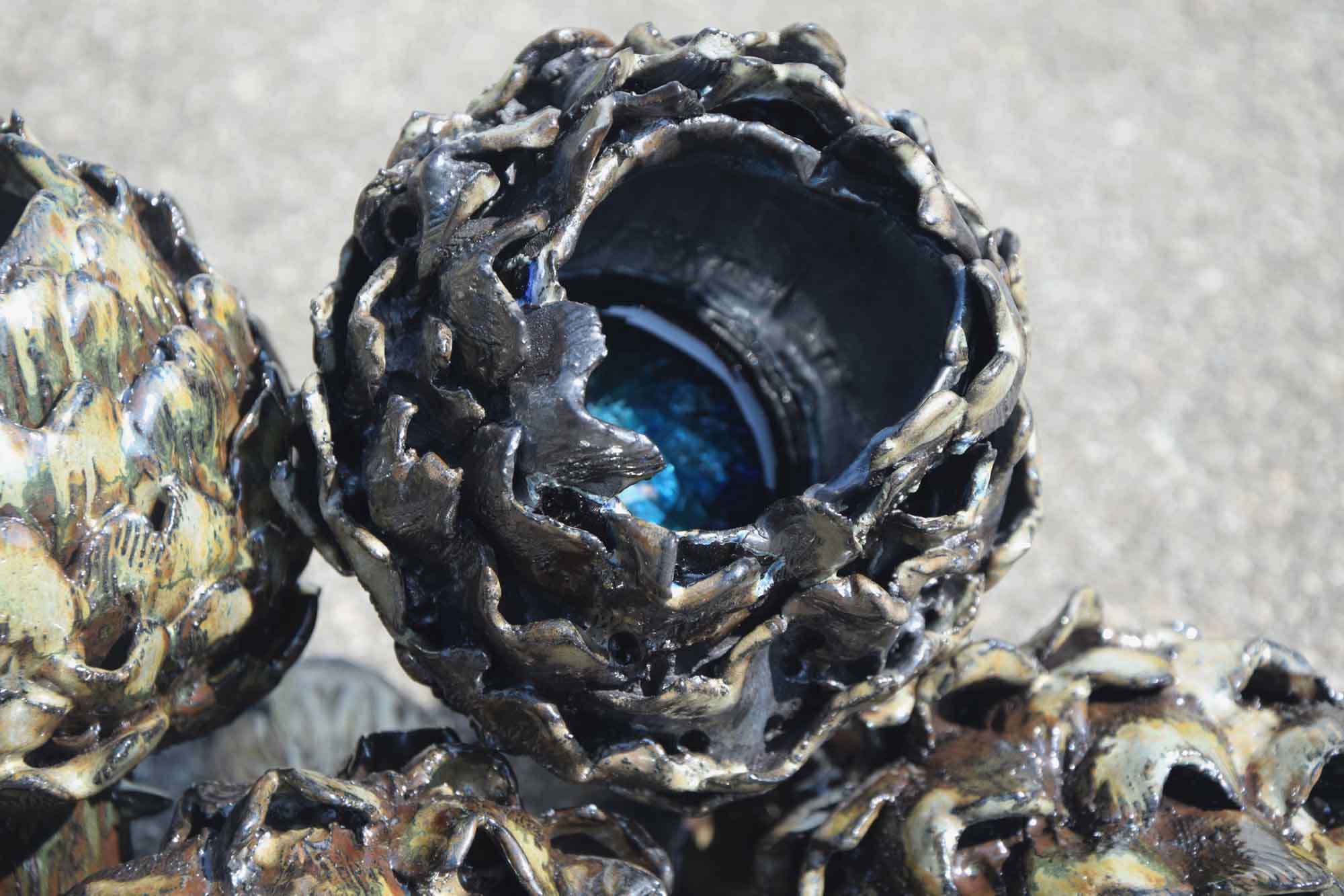 Modelage, grès noir, émaux et coeur en verre de bouteille de bière fusionné lors de la cuisson haute température.